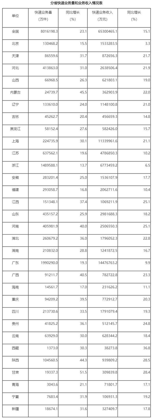 1.部分郵政快遞企業(yè)調(diào)整快遞業(yè)務(wù)口徑,快遞業(yè)務(wù)同比增速按可比口徑計算。
