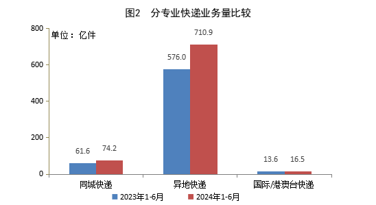 上半年,同城快遞業(yè)務(wù)量累計完成74.2億件,同比增長20.6%;異地快遞業(yè)務(wù)量累計完成710.9億件,同比增長23.4%;國際/港澳臺快遞業(yè)務(wù)量累計完成16.5億件,同比增長21.0%。