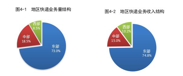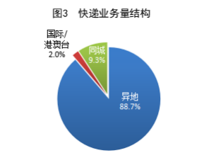 上半年,同城、異地、國際/港澳臺快遞業(yè)務(wù)量分別占全部快遞業(yè)務(wù)量的9.3%、88.7%和2.0%。與去年同期相比,同城快遞業(yè)務(wù)量的比重下降0.1個百分點,異地快遞業(yè)務(wù)量的比重上升0.2個百分點,國際/港澳臺業(yè)務(wù)量的比重下降0.1個百分點。